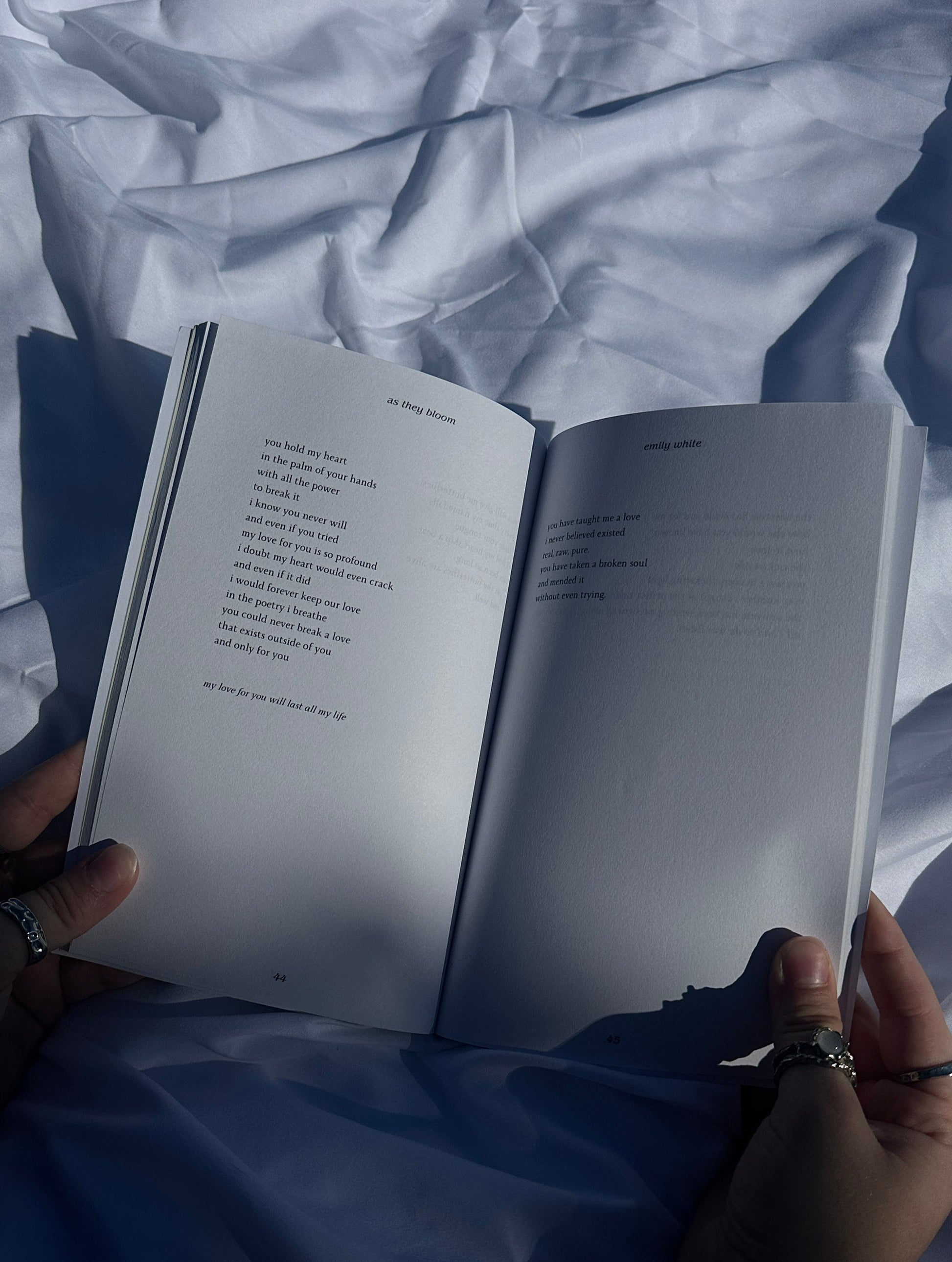 as they bloom is a collection of poetry and prose, divided into three sections; rotting, seeding, and blooming.walking readers through phases of growth shown through, heartbreak, connection, and self worth. from watching yourself fall apart, to planting your roots, to finally letting yourself bloom. as they bloom encourages you to prioritize self love, to see beauty in destruction, and accepting change, for it is the only way to grow.